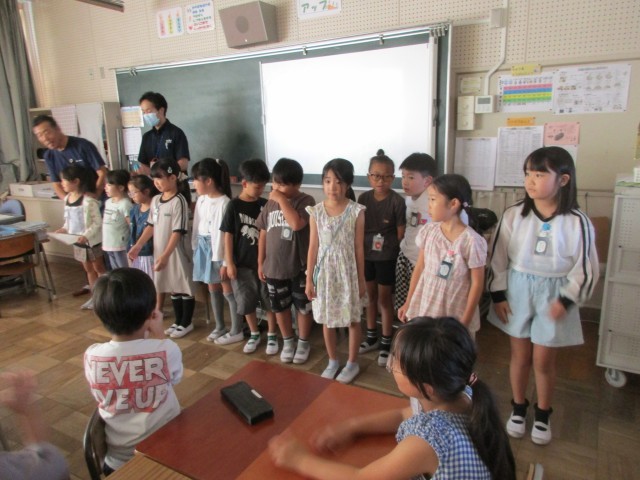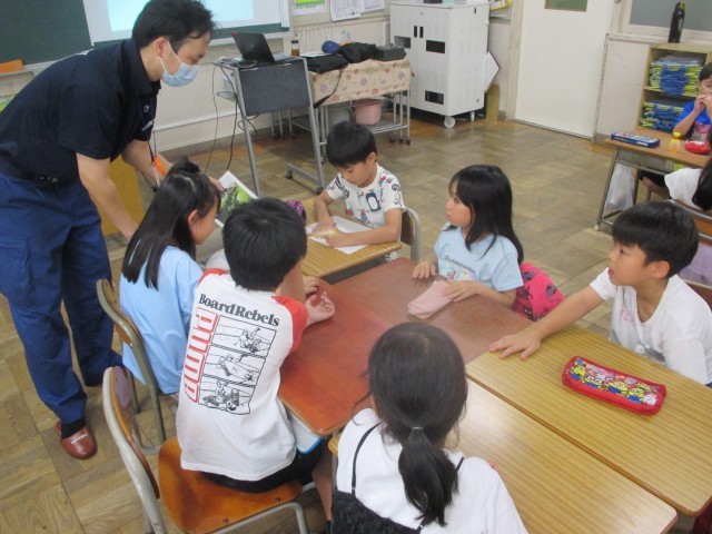 本日、江南消防署から消防士の方にお越しいただき、消防安全教室を開いていただきました。身のまわりの踏切や川辺、空き地などの写真から危険なところはどこか話し合い、安全に生活するために気をつけるべきことを考えました。今日勉強した危ない場所には近づかないようにしましょう。