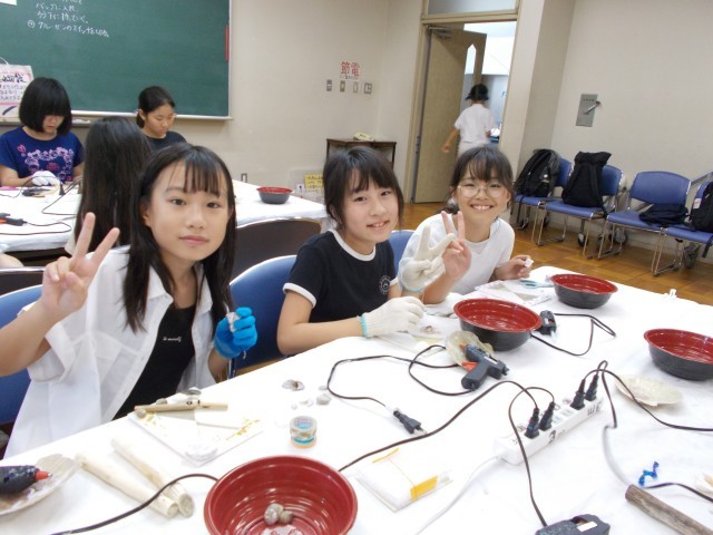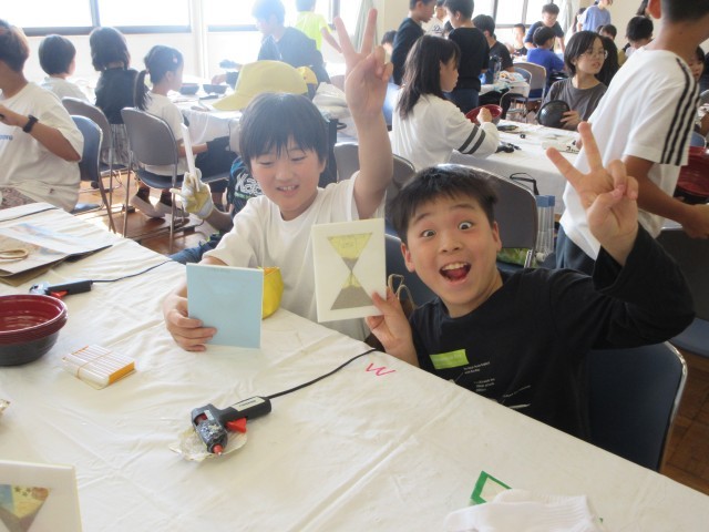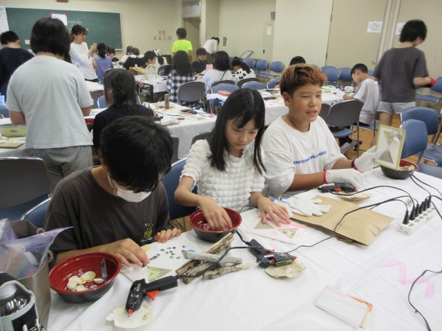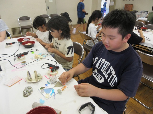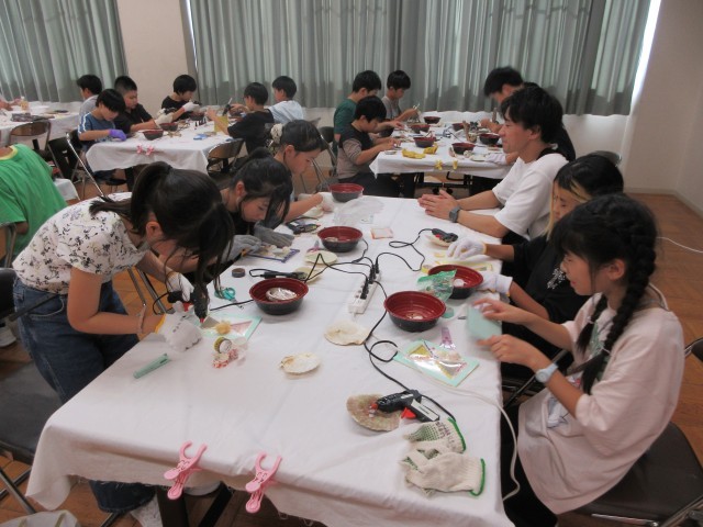 1日目の砂時計づくりの様子です。グルーガンを使って、様々な色、形の貝殻を飾りつけました。