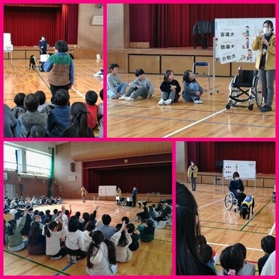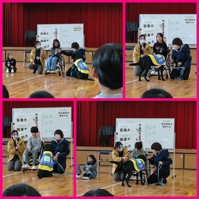 実際に介助犬の働きを見たり、介助される体験を通して福祉についての学びを深めました。