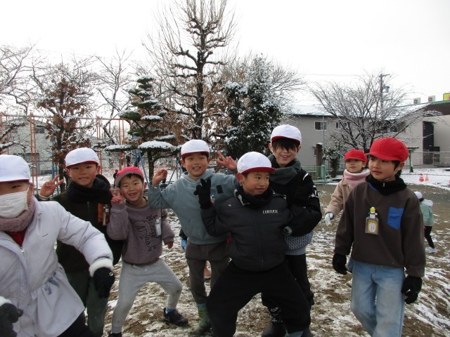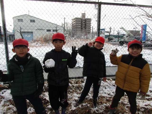 運動場が白くなるほどは積もりませんでしたが、どんぐり山に残った雪をみんなでさわって遊びました。