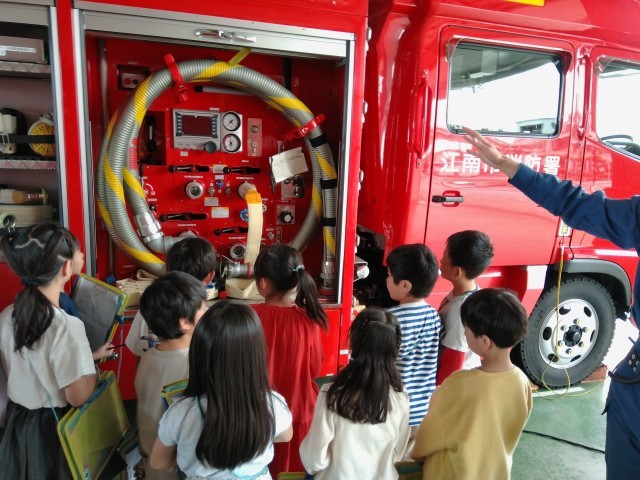 消防士の方から仕事の内容を聞いたり、消防車や救急車などを間近で見たりすることができました。子どもたちは普段見ることのできない設備や道具に興味深々で、たくさん質問をしていました。