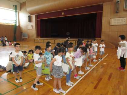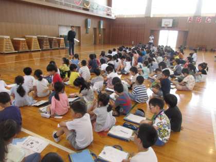 2年生は木曜日の町探検に向けて、学年集会を行いました。持ち物の確認や訪問先でのマナー、歩き方などを確認しました。