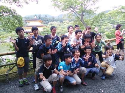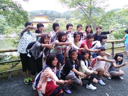 金閣寺で集合写真撮影です。2組です。みんないい笑顔♪ 幸い雨も降っていません。