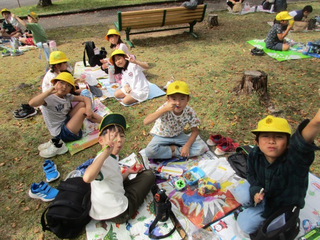 校外学習といえば、子ども達の楽しみはお弁当タイムです。美味しそうなお弁当を友達と一緒に食べました。保護者の皆さま、お弁当のご準備ありがとうございました。