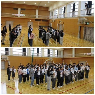 体育館で6年生が集まり、卒業アルバムの撮影をしていました。