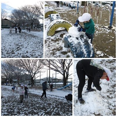 思ったよりも残っている雪が少なかったのですが、タイヤの上、ベンチの上など、まだ残っている雪を見つけて大はしゃぎ。雪玉をつくって投げたり、雪だるまにしたりと思い思いに遊んでいました。