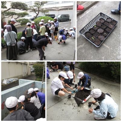 4の2が校舎の軒下でヒョウタンの種を植えていました。雨を避けての活動です。