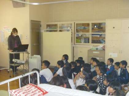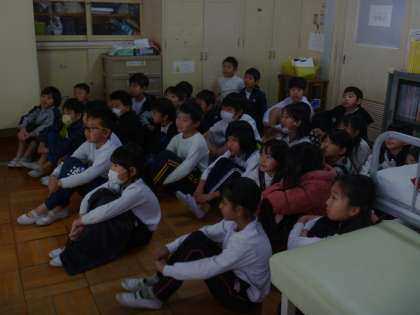 その後、保健の滝本先生から「友達どうしがトラブルを起こしているのを見たらどうするか?」について、紙芝居を見ながらお話を聞きました。