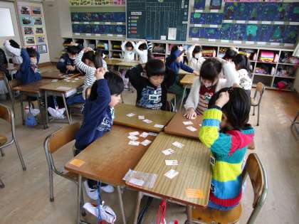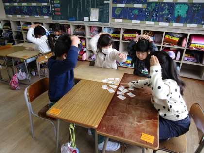 2組では、道徳の授業で「日本の遊び」の学習をしました。「なかよしかるた」をして楽しみました。