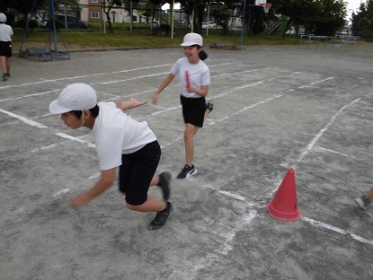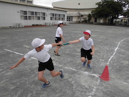 体育ではリレーの学習をしています。チームでアドバイスをし合ったりしながら、バトンパスを上達させる姿はさすがです!