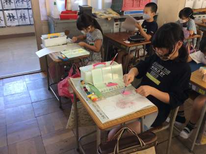 今日の図工では、「まぼろしの花」を想像しながら、描くことができました。歯ブラシやビー玉、スポンジを使いながら花を描きました。