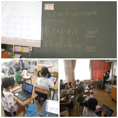 1年生の算数の授業を見に行くと、〇-〇+〇の計算の仕方の勉強をしていました。