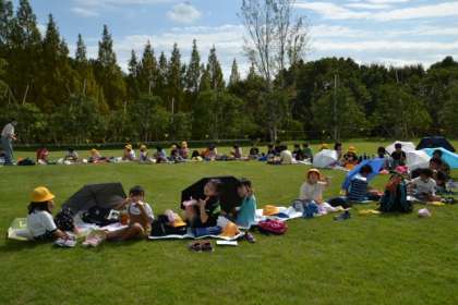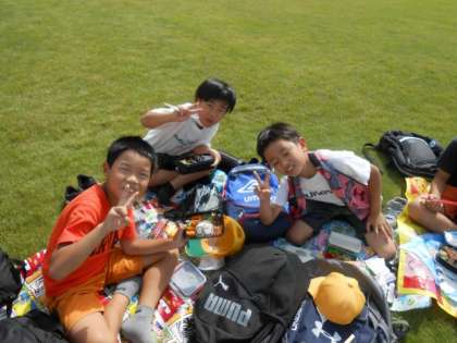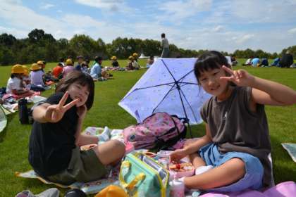 綺麗な青空の下で,みんなで大きな円になって食べました!