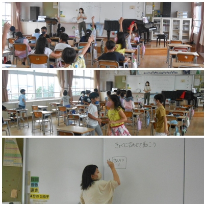 旋律の違いを体を使って表現する学習でした。頭と体を使って学習していく。そして、笑顔で学習する。