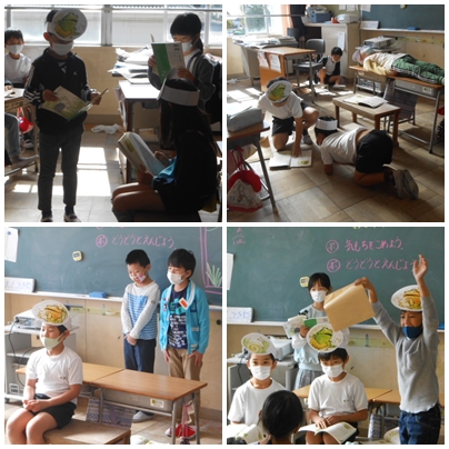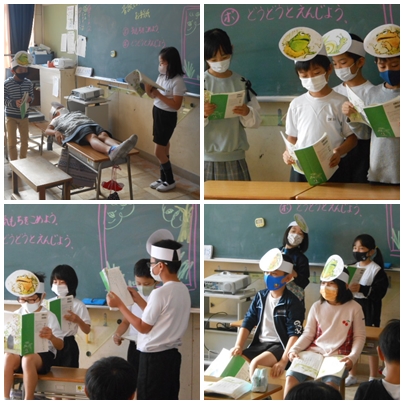 ナレーター、かたつむり、かえるなどの役があり、一人一人が声での表現、体の表現を工夫して伝え、校長先生に伝えようとする思いがしっかりと伝わってきました。