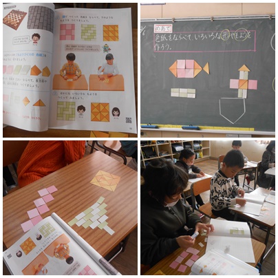 四角形の仲間である正方形と、三角形の仲間である直角二等辺三角形を使って、いろいろな形や模様を作っていました。