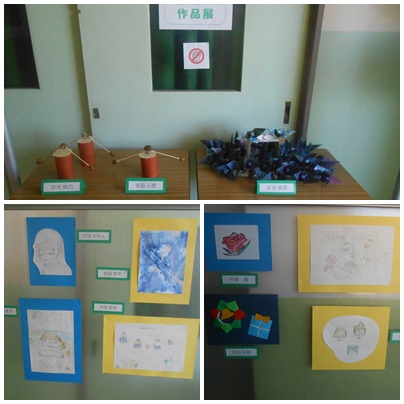 昨日、北館のことをお伝えしましたが、南館にも作品が展示してありました。イラスト・折り紙クラブに所属する6年生の子どもたちの作品です。