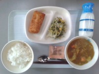 米粉パン 牛乳 ベーコンエッグ ミネストローネ フルーツポンチ 型抜きチーズ