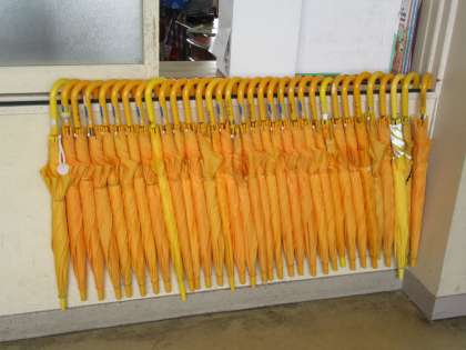 4年1組の廊下、置き傘がきれいに並べておかれています。