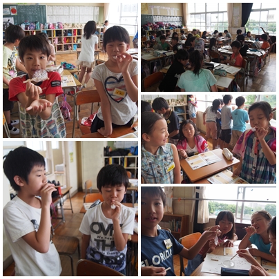 4年生は「環境」をテーマに総合的な学習に取り組んでいます。今日は、世界で一番軽い木と言われるバルサという木を使ってシャボン玉を作ってみました。家で作るシャボン玉と違って、小さい泡がたくさんついたシャボン玉になりました。