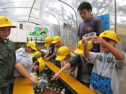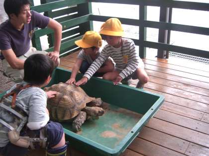 カメ、トカゲ、ヤギ、モルモットなど、いろいろな生きものとふれ合うことができましいた。イモリのプールでは、水の中にいるイモリをつかまえて大はしゃぎ。とっても楽しく過ごせました。