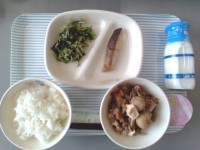 2学期最初の給食です。夏野菜カレーには,かぼちゃ,ピーマン,なす,トマトの夏野菜が入っています。旬の食材なので,栄養価が最も高まっています。