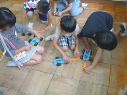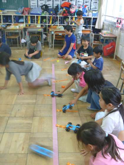 ゴムの力で車を走らせて、枠の中で停車させます。