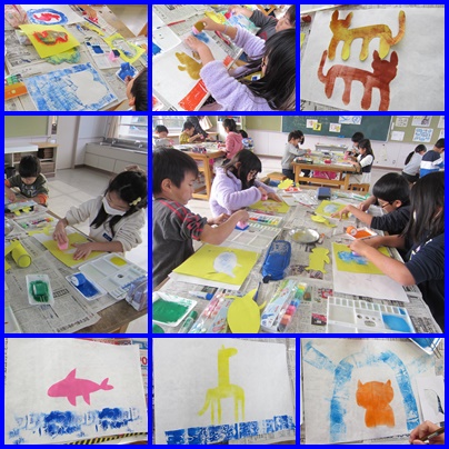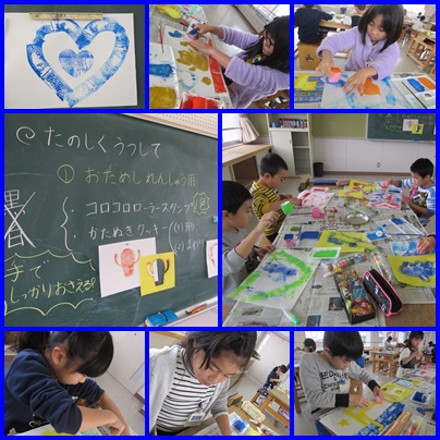 図工は、ステンシルとローラースタンプを使った作品に挑戦しました。