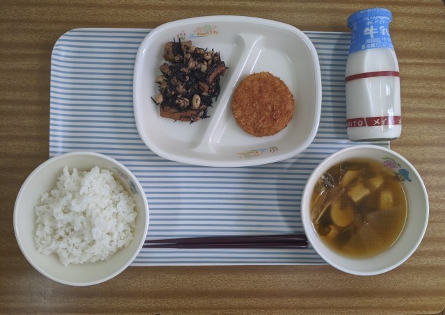 学校行事 【献立】 ごはん ぎゅうにゅう くりいりコロッケ だいずのいそに じゅうさんやじる 11月1日は、十三夜です。十五夜に次いで月がきれいに見える日です。十三夜は豆やくりを供えることから、豆名月やくり名月と呼ばれます。