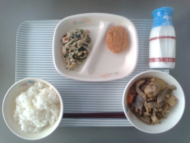 11月8日はいい歯の日です。サラダにはカルシウムの多い小松菜とチーズ、根菜汁にはかみ応えのあるれんこんやごぼうが入っています。よくかんで食べましょう。