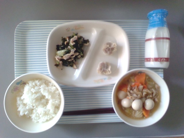 11月8日はいい歯の日です。サラダにはカルシウムの多い小松菜とチーズ、根菜汁にはかみ応えのあるれんこんやごぼうが入っています。よくかんで食べましょう。