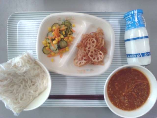 今日は食育の日の献立です。ドライカレーに入っている大豆は愛知県産です。県内でとれる大豆は主にフクユタカという品種で、たんぱく質の含有量が高く、甘みがあります。