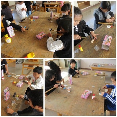 初めて釘を打つ、という子も多く、初めは恐る恐る打っていましたが、慣れてくると手際よく打つことができるようになりました。