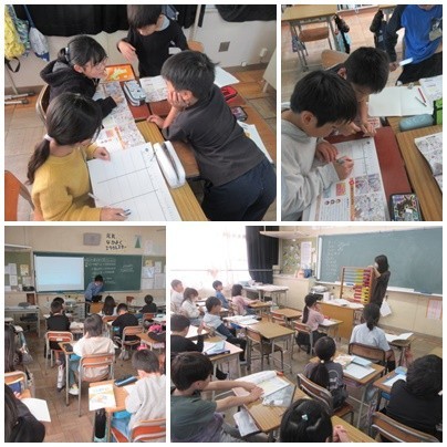 3年生の外国語活動では、好きな食べ物、色、アニメなどを互いに質問し合っていました。