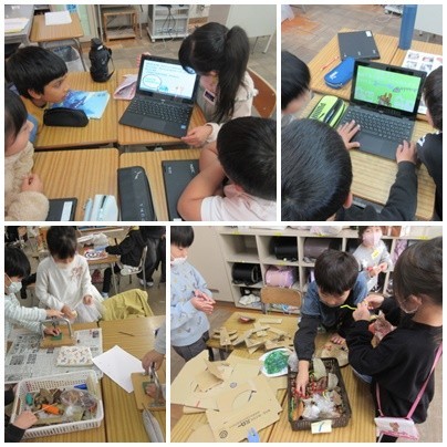 1年生は、段ボールやどんぐりなどを使って、おもちゃ作りをしていました。