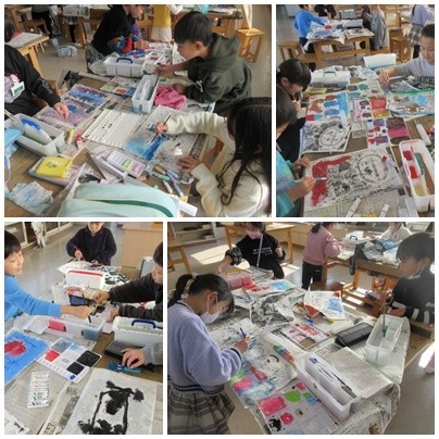 2年生は紙版画の印刷、4年生は木版画の印刷をしていました。