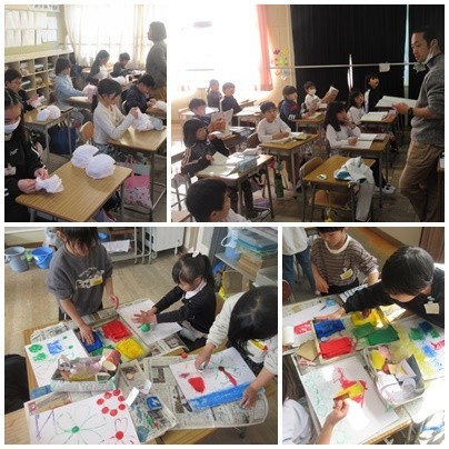 1年生が、絵の具といろいろなものを使ってスタンプのように写していました。