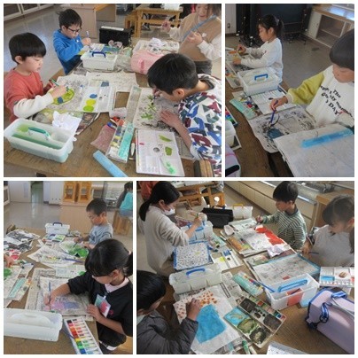 3年生が図画工作科で、紙版画の印刷をしていました。