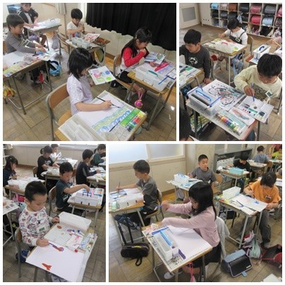 3年生は図画工作科の授業で、絵の具を使って絵を描いていました。