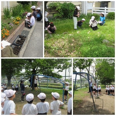 4年生は理科の時間に、運動場やトンボ池で自然観察をしていました。