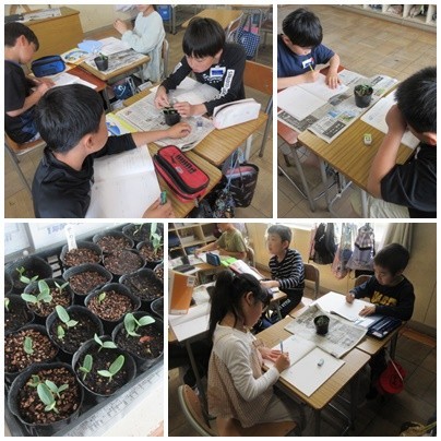 4年生が理科の学習で育てている「ヒョウタン」が、この土日の間にたくさん芽を出しました。