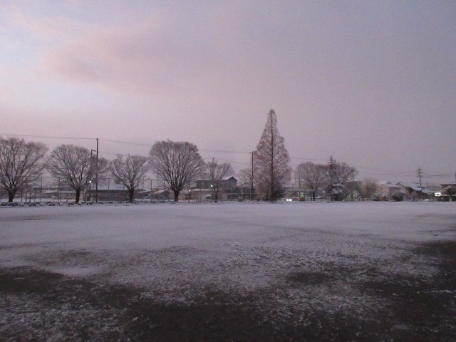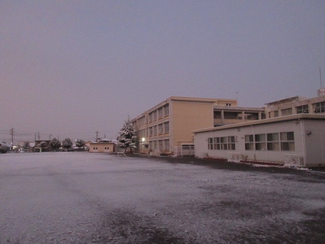 昨晩から雪が降り続き、運動場にも雪が積もっています。