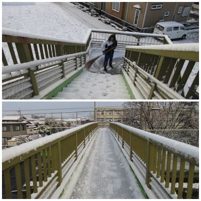 融雪剤をまき、雪かきをすることで、校庭や隣接する歩道橋が安全に通れるようになりました。