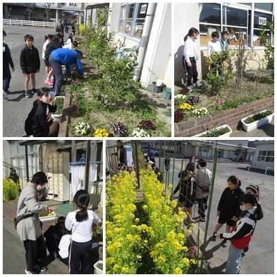 外に出てきた4年1組が花壇を見つめていました。