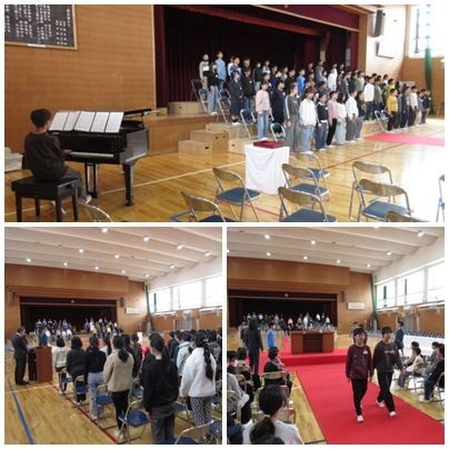 朝は寒かったのですが、時間が経つにつれ、徐々に暖かくなってきました。それでも、体育館は日差しが弱く少し寒いです。そのような中ですが、体育館では卒業式の練習を行いました。