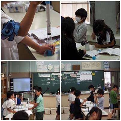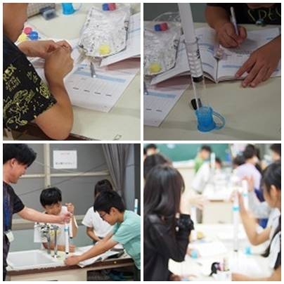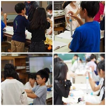 4年生理科、空気を筒に閉じ込めて押し、手応えの大きさを調べています。