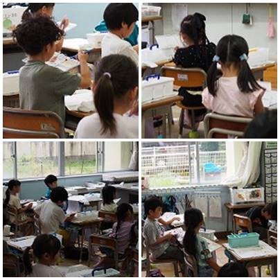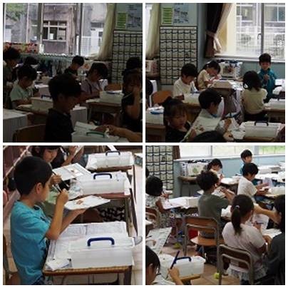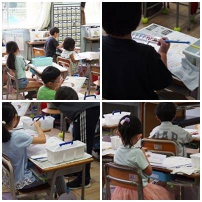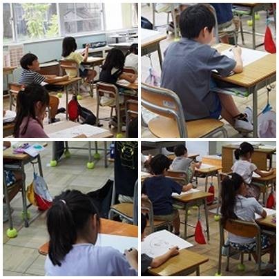 1年生図工、画用紙にかいた下書きに絵の具を使って色をつけていきます。パレットの使い方も学びました。どんな絵になるでしょうか。