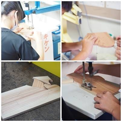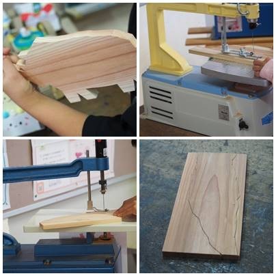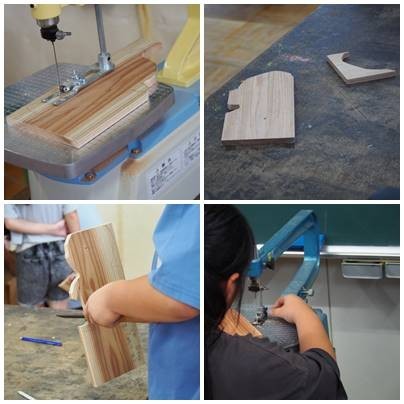5年生は、糸のこぎりを使って木の板を切っています。複雑な形を板を動かしながらうまく切っています。