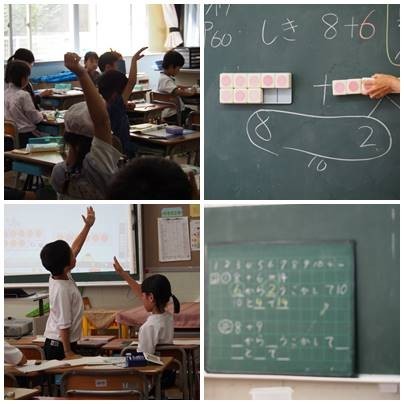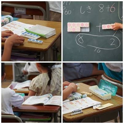 1年生算数「くりあがりのあるたし算」ブロックを使いながらくりあがりのあるたし算の計算方法を学んでいます。