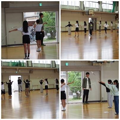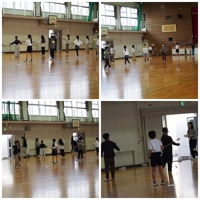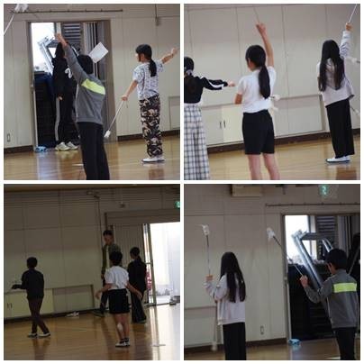 昼休み、体育館では、5年生がトワリングの特訓中です。